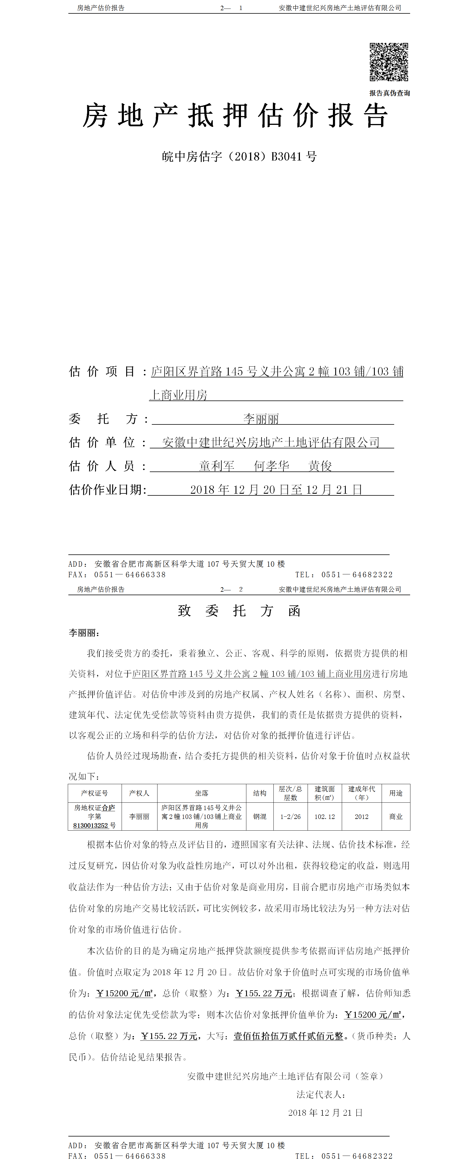 34ZJ0001357-B3041庐阳区界首路145号义井公寓2幢103铺、103铺上商业用房 李丽丽 徽行长江路支行--续贷
